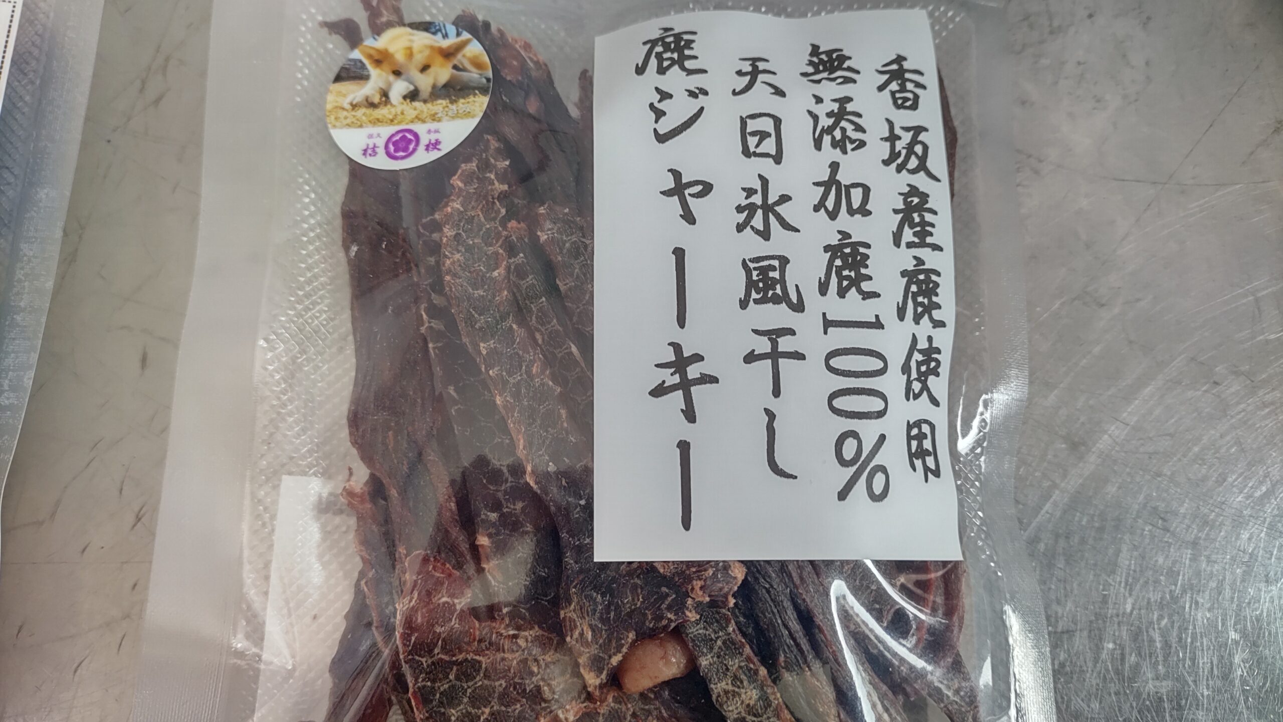 当店の主力商品鹿ジャーキー・・鹿の精肉を一枚づつ丁寧に天日氷風干しに仕上げました・・背ロースやモモの上級部位も惜しみなく入っております・・100g入り1000円